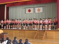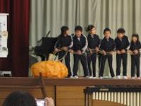 広場の時間から3校時にかけて、長縄跳び大会を実施しました。例年、学年学級対抗でしたが、今年度は検討して二宮班で行うことになりました。1年生から6年生までの子どもたちが、一緒に長縄跳びを行います。はじめに練習時間をとりました。班ごとに相談して、6年生から跳んだり、1年生から跳んだりしていました。次に競技です。3分間で2回跳びました。声を掛け合いながら跳んだり、上級生が下級生の背中を押してタイミングを教えたり、と協力する姿が各所で見られました。1年生と6年生とでは、跳び方の技能が異なりますが、どの班も下級生もいきいきと活動していました。充実した大会となりました。子どもたちの頑張る姿に元気をもらいました。ちなみに第1位は、1班です。