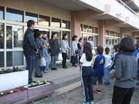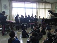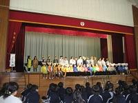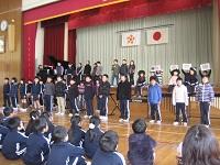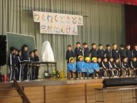 広場の時間に音楽朝会を実施しました。7日を予定しておりましたが、9日に変更したものです。今回の発表は12年生です。はじめに全校生で「世界に一つだけの花」を合唱しました。13日の感謝の会で、学習ボランティアの皆様に贈る歌です。続いて1年生の発表です。絵描き歌を歌って実際に黒板に絵を描きました。全員で「きらきらぼし」を鍵盤ハーモニカで演奏しました。2年生は、童歌をうたいながら踊りました。「ぷっかりくじら」「こぐまの2月」を歌ったり鍵盤ハーモニカで演奏したりしました。かわいい歌声を響かせました。ちなみに絵描き歌で画いた絵の一つはドラえもんです。
