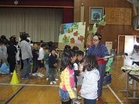 本日、1年生が2~3校時に体育館で「秋の宝物ランド」を実施しました。生活科の学習です。秋の木の実などを使っておもちゃやゲームなどを作り、「松ぼっくりストライク」や「どんぐりつり」「どんぐり迷路」「どんぐりおもちゃ」などのお店を出しました。今年は、今市幼稚園と原町みどり保育園の園児を招待しました。学校では、最年少の1年生もこの日はお兄さんお姉さんです。園児に丁寧に説明したりゲームを楽しんでもらったりしていました。お店を早めに終了した子ども達の中には、園児が首から下げているメダル(どのお店があるかわかるようにしたもの)を見て、まだ回っていないお店に案内する子もいました。また、園児に「来てくれてありがとう」とやさしく声を掛ける子もいました。1年生のやさしく頼もしい姿に、教員たちも感動していました。1年生の子ども達こそ「秋の宝物」として輝いていたとうれしく思います。今一番輝いていた1年生です。