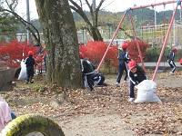 2校時に第2回二宮デーを実施しました。今回は、落ち葉掃きや落ち葉拾いなどの仕事をしました。学年ごとに分担場所に分かれて作業しました。5・6年は、学校周りの道路の清掃をしました。持久走大会のコースでもあります。袋につめた落ち葉は、子どもたちにとって結構重かったようですが、一輪車などで運んでいました。皆で協力して働くことの喜びを感じたことと思います。今中マイチャレの生徒も参加し、よいお手本を示してくれました。