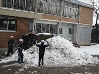 広場の時間には、5年生と6年生が雪かきの作業をしました。5年生は、下校の際に集合場所となる前庭の雪かきをしました。6年生は、保護者の皆様や来校者の駐車スペースとなる校庭の雪かきをしました。雪かきの道具が十分ではありませんが、スコップで雪を一輪車に載せて運んだり、雪玉を作って転がしたりと、工夫しながら作業をしました。前庭の集合場所の雪はほとんどなくなりました。校庭も車を止めるスペースの雪は少なくなりました。慣れない子どもたちの作業ですが、皆で協力すると大きな力となります。子どもたちの協力にも感謝です。しかし、体育館や講堂の屋根からは、まだまだ雪が落ちそうです。カラーコーンを置き、立入禁止としています。