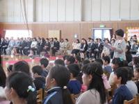 9月16日、生活安全課の方々を講師に招いて、不審者対応避難訓練を実施しました。はじめに不審者に遭遇した場合の対処の仕方についてお話を聞きました。次に学年の児童の代表3名が遭遇した場合の練習をしました。児童は、「助けて」と大声をだしたり、防犯ブザーを鳴らしたり、と自分なりに対応しました。