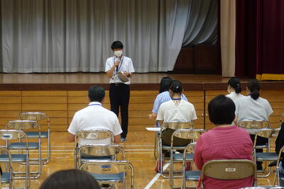 授業参観後には、体育館にお集まりいただき、東洋羽毛工業株式会社の星野知様から「睡眠で未来が変わる!」という演題で講話をしていただきました。