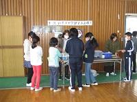 ロング昼休みに、体育館でランチ委員会が「野菜当てクイズ大会」を開催しました。今週は学校給食週間として、給食の献立は特別メニューです。お昼の校内放送では、ランチ委員会の児童が給食に関するお話をしています。その一つとしてのクイズ大会です。箱の中に入っている野菜を手で触り、解答用紙に記入します。ゴールでは、委員会の児童が答え合わせをし、メダルを贈ります。クイズ終了後には、手洗いチェッカーもあり、多くの児童が参加していました。食に関する学びあり、手洗いに関するまなびありの大会でした。ランチ委員会の児童が活躍しました。