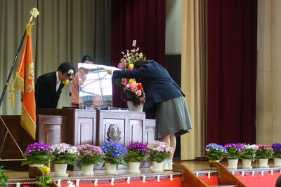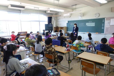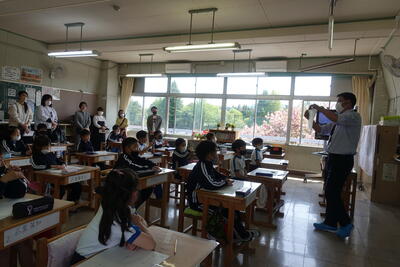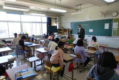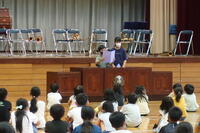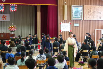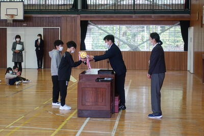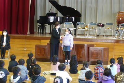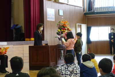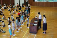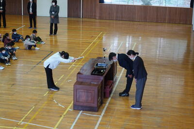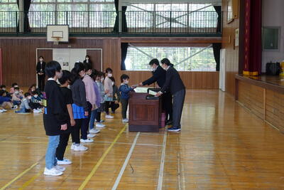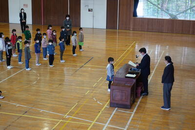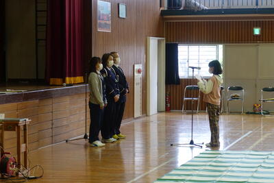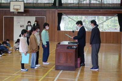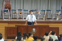 校歌斉唱のあとは、市の模範児童として池田さんと西岡さんが表彰されました。これからも下級生のお手本としてがんばってほしいものです。そして、新しく赴任された川原田知世(かわらだ ちせ)先生の紹介がありました。川原田先生は運動が得意で、特に剣道は5段の腕前ということです。早く今市小に慣れて子どもたちと元気に過ごしてほしいものです。