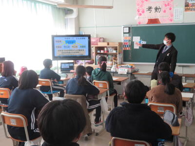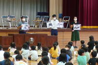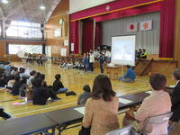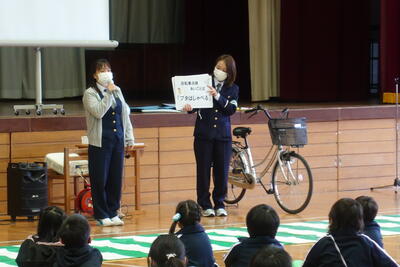 交通担当の大橋先生からは、自転車の乗り方についてのクイズを出し、自転車の走ってよいところ、罰則、飲酒運転、ヘルメットなどについて説明し、ルールを守って安全に自転車に乗ってほしいと話していました。