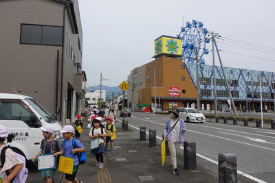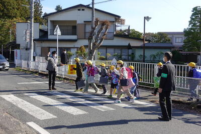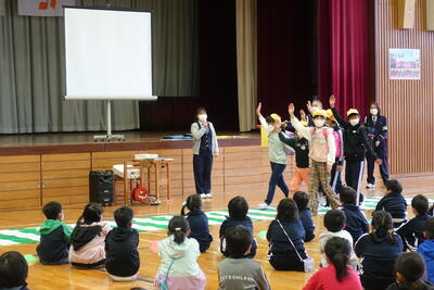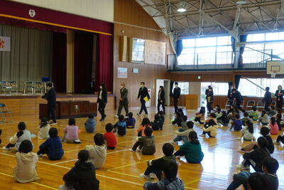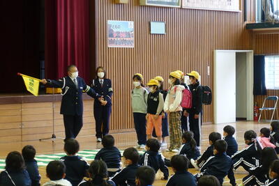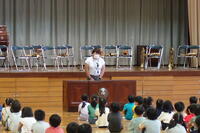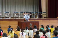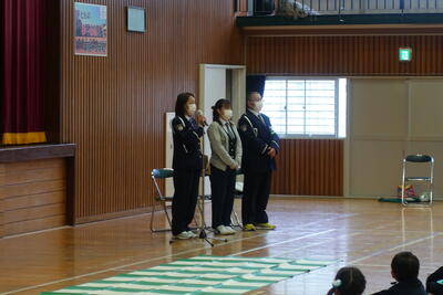 星野校長先生からは、自分の身は自分で守ること、合い言葉「お(さない)、か(けない)、し(ゃべらない)、も(どらない)、ち(かづかない)」を詳しく話していただきました。子供たちは真剣に校長先生の話を聞いていました。