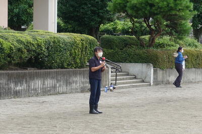 校長先生からは、6月の歳時についてお話がありました。「水無月」「衣替え」「夏至」「梅雨」などの由来や意味などを分かりやすく話されました。また、近くに勤める方から「毎朝元気にあいさつしてくれて、一日がんばろうと思った。今小の子どもは素晴らしい。」とお褒めの言葉をいただいたことを紹介されました。校長先生の話を聞く子どもたちの態度が大変よく、校長先生はあいさつができたこととあわせて称賛していました。