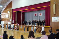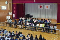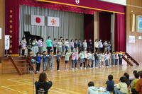 児童代表茂庭さんの発表 校歌斉唱の様子
