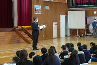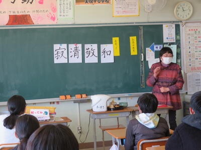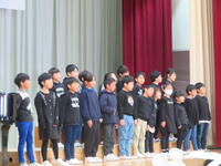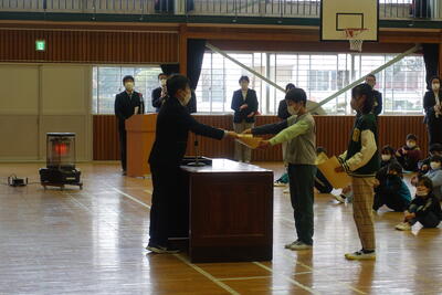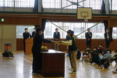 黒澤校長先生からは、「2学期は運動会、150周年記念式典、持久走大会、臨海自然教室、修学旅行など、たくさんのことがあったが、みなさんはよく頑張っていた。頑張ったこと、よくできたことを担任の先生が心を込めて通知表に書いている。大切に持ち帰って家族と振り返り、3学期また頑張ってほしい。」と激励の言葉をかけていました。また、家族、地域などたくさんの方々に支えられていることに感謝して、家族の一員として何か役立つことをして、新年を迎えてほしいと話されていました。
