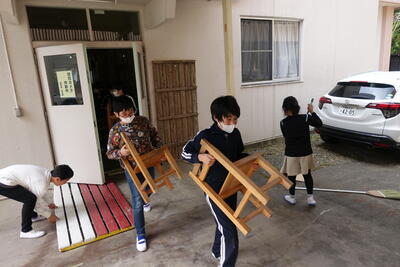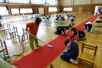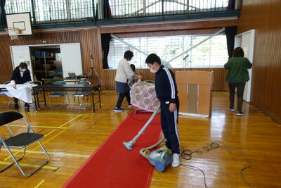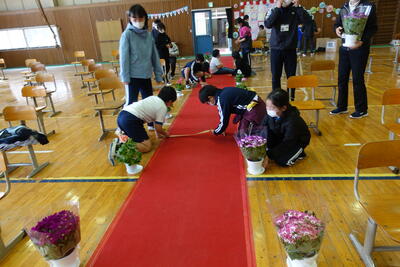 5年生の準備はてきぱきとしていて、6年生のために心を込めていす並べや飾り付けをしていました。代表委員のみなさんは自分たちの明日の会をよいものにするために責任感ももってリハーサルをしているのが感じられました。4年生有志も6年生が気持ちよく花のアーチをくぐってもらえるように花をきれいに整えていました。