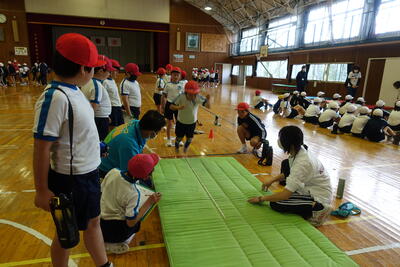 5月29日(水)・30日(木)に新体力テストを行いました。1年生は6年生と、2年生は5年生と、3・4年生は学年ごとで各種目に取り組みました。29日(水)は室内種目(反復横跳び、長座体前屈、立ち幅跳び、上体起こし)を30日(木)は外の種目(50m走、ソフトボール投げ)を行いました。1年生にとっては初めての新体力テストでしたが、最後までがんばっていました。2年生以上も記録向上のために精一杯取り組んでいました。