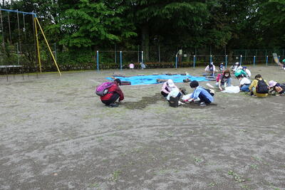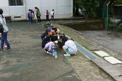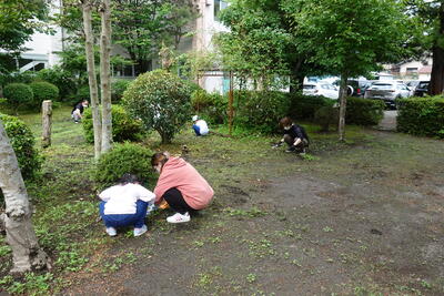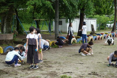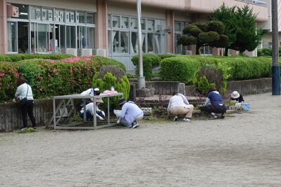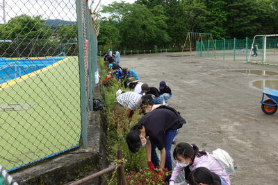 6月19日(水)に二宮デーとして全校生で除草作業などを行いました。低学年は中庭、中学年は前庭、南棟前、高学年は正門近辺、プール、講堂と場所を分担して行う予定でした。しかし、日差しが非常に強く、熱中症予防の観点から日陰の場所で除草作業ができるように場所を変更して行いました。