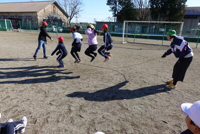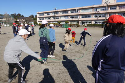 2月2日(木)の広場の時間に「なかよしタイム」がありました。1~6年生の二宮班(縦割り班)で長縄(8の字跳び)をやりました。それぞれの班で「はい!」とかけ声をかけながらみんなで楽しく跳ぶことができました。長縄はこれまで何度かやってきました。1・2年生をはじめ、どの学年もどんどん上手になっています。連続して跳ぶことのできる子が多くなりました。5・6年生はさすがに上手で、1回転しながら跳んでいる子もいて驚かされました。