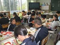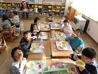 1年生にとって初めてのリクエスト給食です。献立は、コーンスープ、マカロニサラダ、唐揚げ、コッペパン、雪見だいふくです。1年生と担任とで相談して決めました。大きな口を開けて、唐揚げやパンをほおばる子供たちがとてもうれしそうでした。