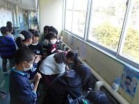 エチケット委員会の活動として、歯磨き活動が始まりました。給食後の歯磨きタイムの時間に、委員会の児童が数名各学級を訪問し、歯磨きのポイントを説明し、歯磨き体操を行います。今日、訪問したのは1年1組です。歯ブラシの使い方を歯の模型を使ってわかりやすく説明しました。1年生もじっと見つめ、よく聞いていました。歯磨き体操の際には、委員会の児童が1年生の様子を見守りました。委員会の児童が頼もしく見えました。