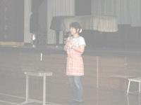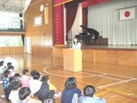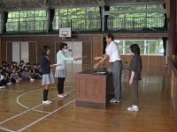 3年生でお世話になった山内先生の離任式を行いました。山内先生から「3年生と楽しく過ごせました。皆さんの活躍を楽しみにしています」というお話をいただきました。3年生の代表が「お別れの言葉」を伝え、児童会からの花束を贈りました。