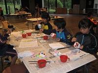なす高原自然の家に到着後、入所式をし、さっそく「ふくろうの絵付け」をしました。下絵を見ながら、思い思いにすてきなふくろうを仕上げました。夕食後には、「キャンプファイヤー」をしました。「猛獣狩り」などのゲームで大いに盛り上がりました。あまりの元気に引率の教員も感心するほどでした。