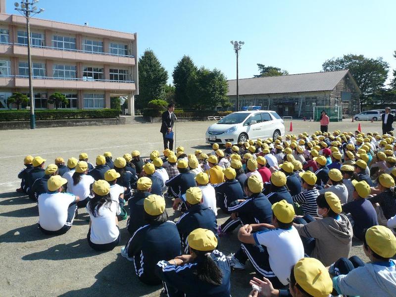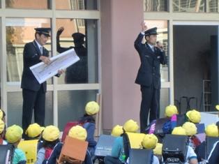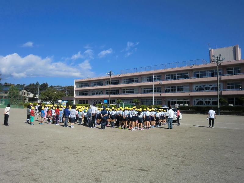 今日は、子どもたちには日時を知らせないで、地震から火災が発生したという設定の避難訓練を行いました。業間の時間に突然「避難訓練を始めます!」との放送があり、すぐに緊急地震速報の警告音、ゴーという揺れの音。子どもたちは身を低くしました。続いて家庭科室からの火災が発生したという設定で、校庭へ避難指示が出て、すばやく校庭へ集合しました。