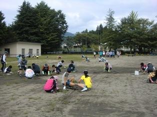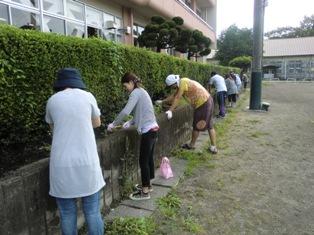 二宮班(1~6年生の縦割り班)ごとに、6年生の班長を中心に草取りをしました。校庭が広く、草もたくさん生えていましたが、全校生と先生方とで黙々と草をとり、きれいになりました。