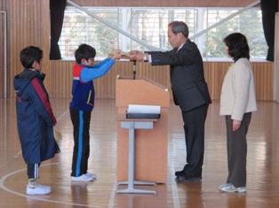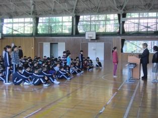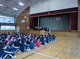 毎日お世話になっている交通指導員さんをお迎えして、広場の時間に感謝の会を行いました。児童からは、お礼の言葉と花束・記念品をお贈りしました。交通指導員さんから、「登下校では、ポケットに手を入れて歩かないように。手袋をきちんとする。雪などを投げたりしない。自動車がそれを避けようとして事故になることもある。」とお話がありました。最後に「世界に一つだけの花」を全員で歌いました。今日言われたことは必ず守って、安全に登下校をしていきましょう。
