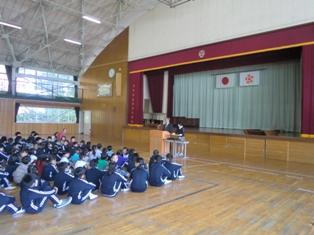 月に一度の朝会で、たくさんの表彰をしました。また、学校長から、今日12月1日が吉田有希ちゃん事件からちょうど9年目に当たることから、日頃から注意を怠らないで生活してほしいと話をしました。