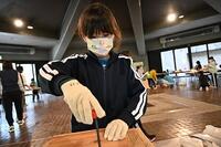 写真は、クイズの集計をしているところです。