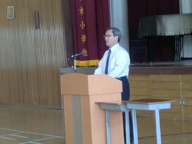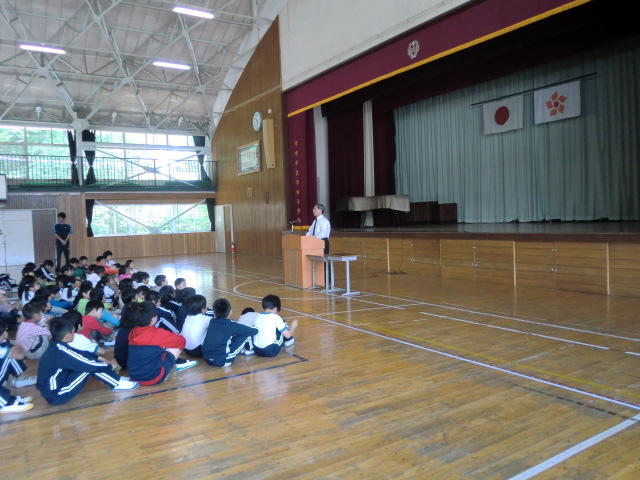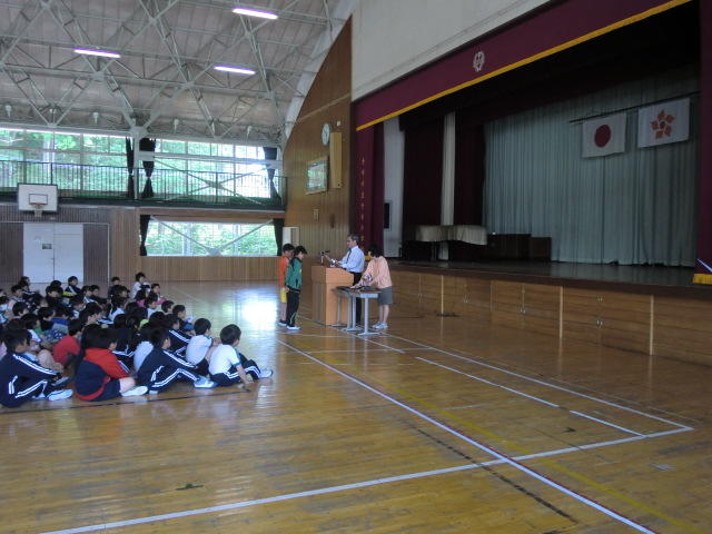 代表の児童2名は、「1学期頑張ったことと夏休みに頑張ること」と題しての発表でした。とてもすばらしい内容でした。校長先生は、「自分は1学期何を頑張ったのか考えること」と、「夏休みの目標を立ててしっかりとした生活をすること」の2つについてお話をされました。37日間を有意義に過ごしてほしいと思います。
