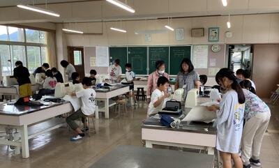 6年生はトートバッグを制作しています。1年ぶりのミシンに使い方を思い出しながら、友達同士で教え合う場面もたくさん見られました。