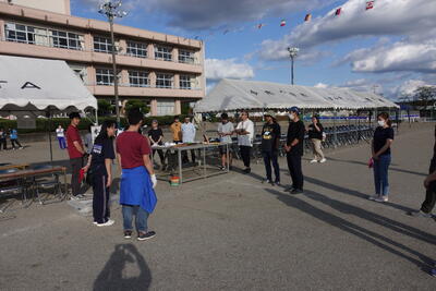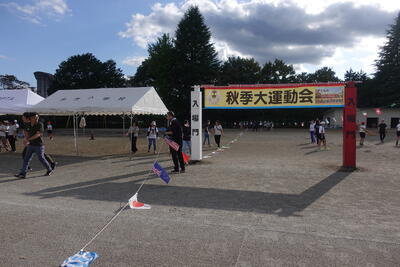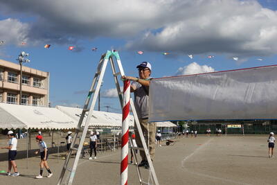 PTA役員、保護者の皆様、ICMおやじの会の皆様にはテントや万国旗張りをしていただきました。また、今年も、元校長先生に入退場門の幕張りをしていただきました。