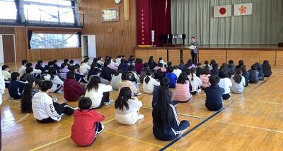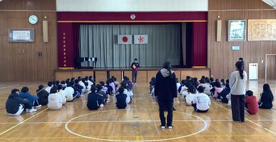 その後、全校生が体育館に集合し、直井様からお話をいただきました。不審者に対しての距離感、手やランドセルをつかまれたときの対応、「いかのおすし」等を丁寧に教えていただきました。校長先生の話では、不審者もそうですが最近報道で話題となっている熊のことも取り上げ、「自分の命は自分で守る」ようにとお話ししてました。