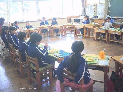 給食の様子。配膳室から給食当番と先生でワゴンを運びます。