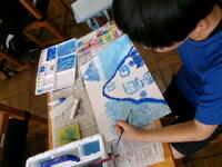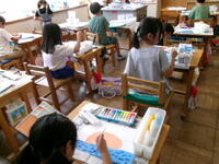 2年図工、絵の具の混色や筆のタッチを楽しみながら、「えのぐじま」という島をかきます。