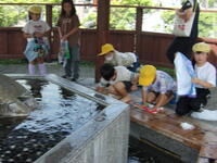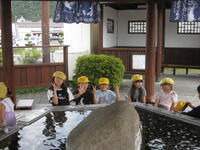 観光客の方や地域の方に話しかけて頂き、子どもたちは元気に挨拶をしたりお話をしたりと、町の温かさを感じながらの貴重な時間でした。足湯を使った後は、座る場所が濡れてしまいましたが、「これじゃ他の人が座れないよね。」とタオルで拭き始めた子どもたち。素晴らしい気付きでした。
