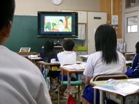 5年英語、動画のやりとりを聞いて、ワークシートの質問に答えます。