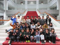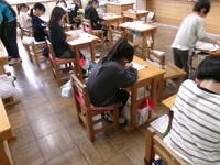 昼休み、校庭で応援団が練習します。ほかの人たちは校舎内外で昼休みです。