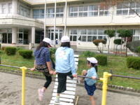 1・2年体育、表現(ダンス)。校庭で隊形移動を練習します。
