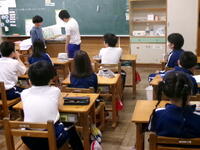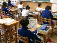 1年国語、「ついたち」「ふつか」などひにちの言い方の学習。漢字で書いてあるカードから先生の言ったひにちを選びます。