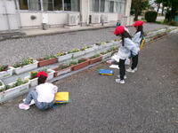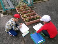 1年国語、草花などを見つけて、色や手触りなどを言葉にしてみんなに伝えるためよく観察します。