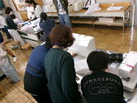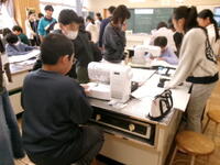 6年家庭科、ミシンボランティアの方が見守る中、トートバッグを縫います。