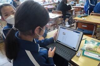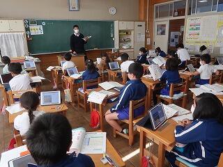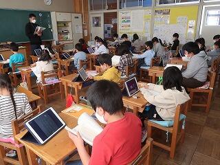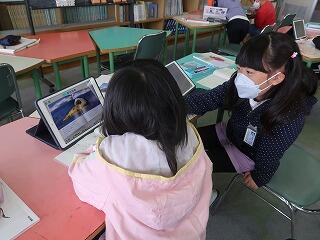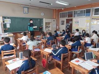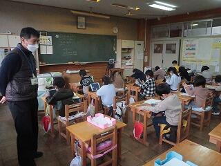 担任の先生は20年目研修のため不在です。補教の先生方が入れ替わりで1年生の学習支援を行いました。タブレットで1年生の算数の復習をしています。担任が不在でも学習に向き合うことができる児童の姿に成長を感じました。