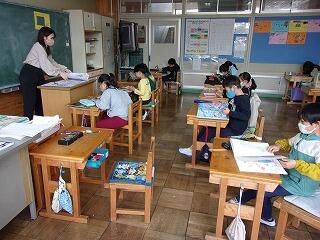 3年生は算数の計算問題に取り組みました。プリントの計算問題を時間内に解くという学習でした。速く正確に解けるよう熱心に取り組んでいる児童が多く、教室がシーンと静まっていました。時間終了の「ピッ、ピ-。」というブザーの音にびっくりするくらい集中している児童もいました。基礎的・基本的な学力定着とあわせて、集中して学びに向かう姿勢も醸成したいと考えています。