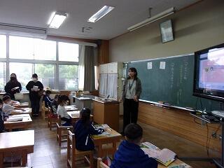 1年生の外国語活動について紹介します。「すぽーつのいいかたをおぼえよう!」がめあてです。工夫された自作のピクチャーカード見せて、誰が何をしているのか、ボールの形や色、選手がもっているものなど、いろいろな角度から質問をしています。詳しく知っているこどもが元気よく答えていました。最後はお決まりのはえたたきゲームです。よく発音を聞いて楽しく活動していました。