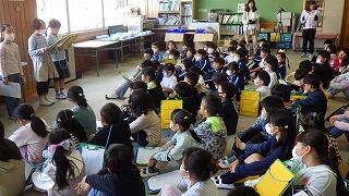 1年生は2週間に1回、ALTによる読み聞かせをしています。「はらぺこあおむし」ように、絵を見て容易に理解できる内容の絵本を使っています。