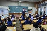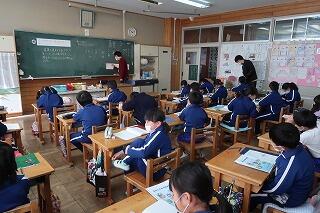 担任の先生と栄養教諭が連携して食育の授業を行いました。給食のメニューを作る調理員さんの仕事について映像を見ながら、給食の良い食べ方を考えました。