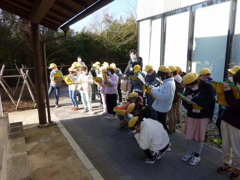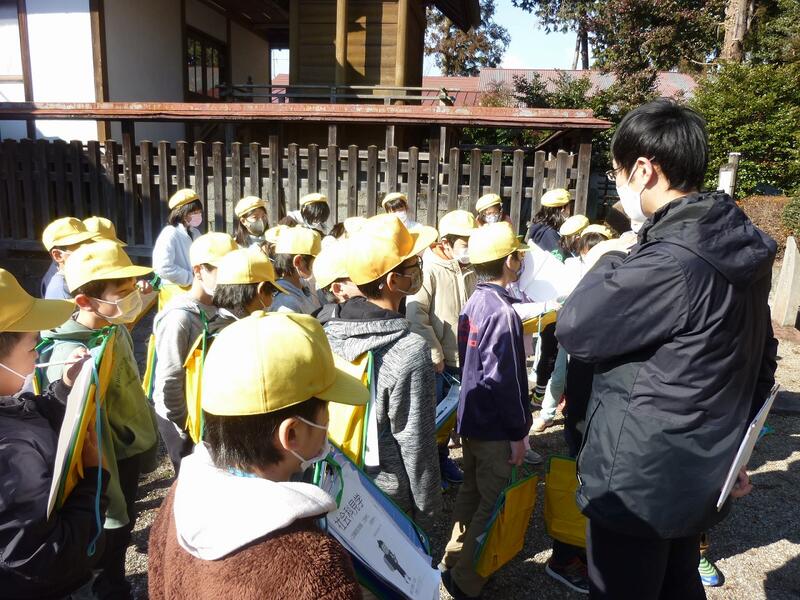 図画工作担当の湯澤先生の自己紹介の後、校庭に出て題材にする春を探しました。