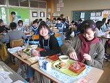 「よい姿勢見守り隊」のたすきをかけた校長先生が各学級を巡回し、よい姿勢でマナーを守って給食を食べているかどうか確認をしました。