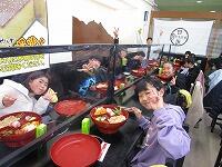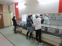 感染症予防のため、手洗い、うがい、消毒をしっかり行い、全員が同じ方向を向いて静かに食べています。