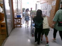 給食が終わると、食器や食管のワゴンを調理室前に運びます。