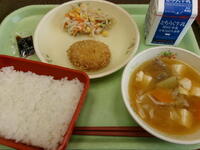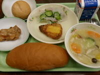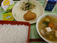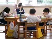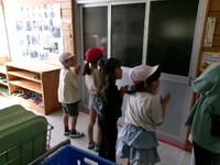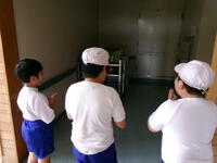 室内の調理員さんに聞こえるようお礼を言います。「〇年〇組です。ごちそうさまでした!」